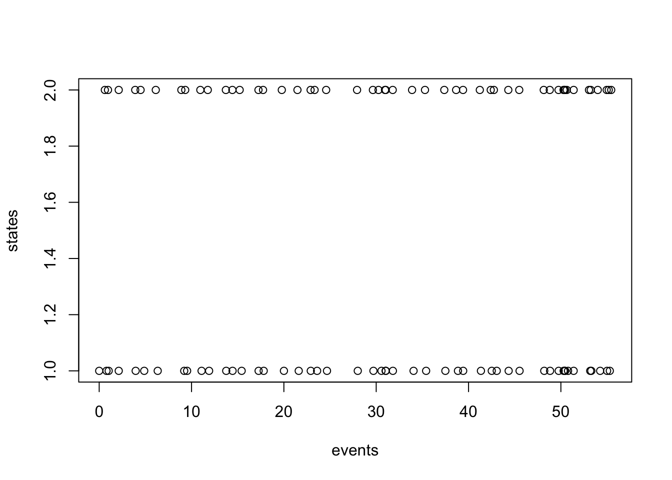 The output of this simulation is going to be a list/vector/whatever of event times. We start at time zero. I’m going to decide at the outset that I want to simulate 100 changes of state, so we will have 100 event times.